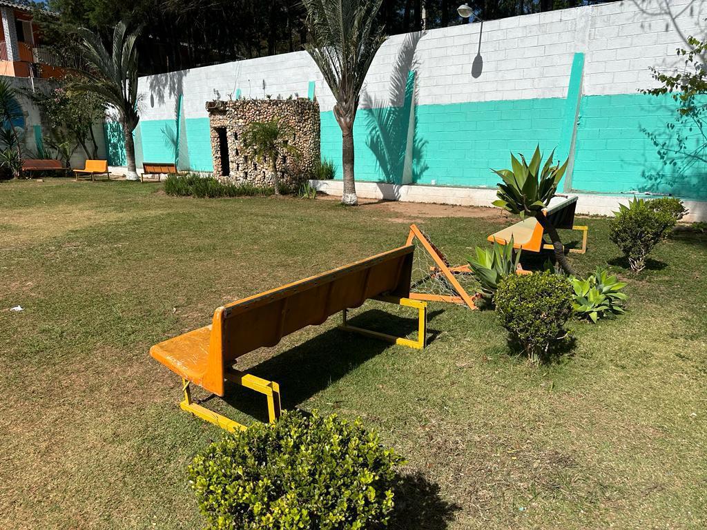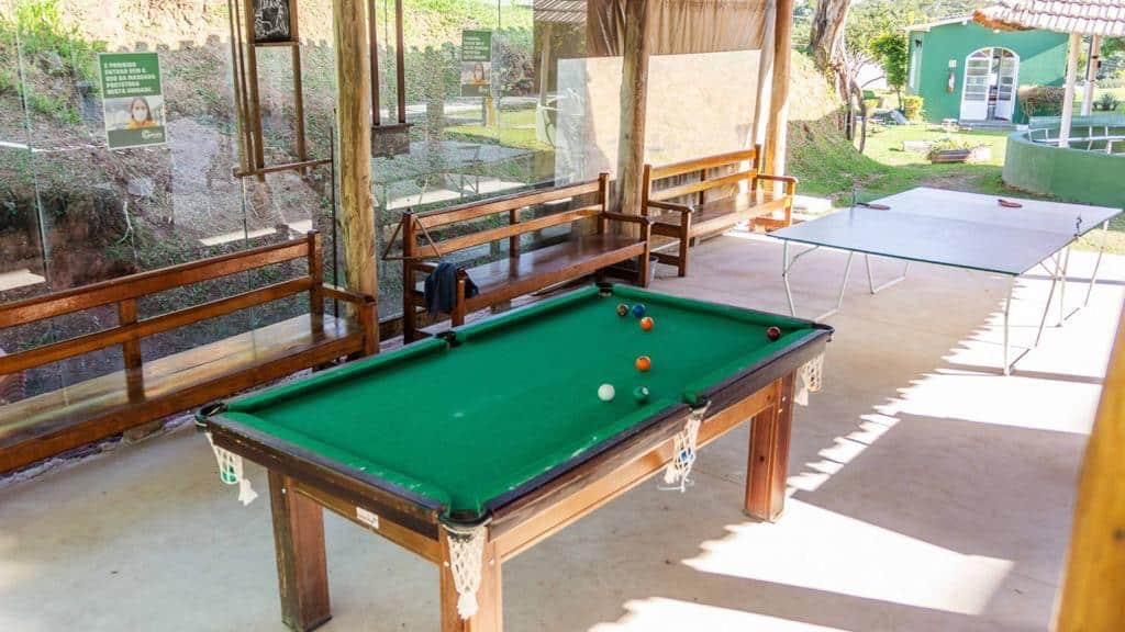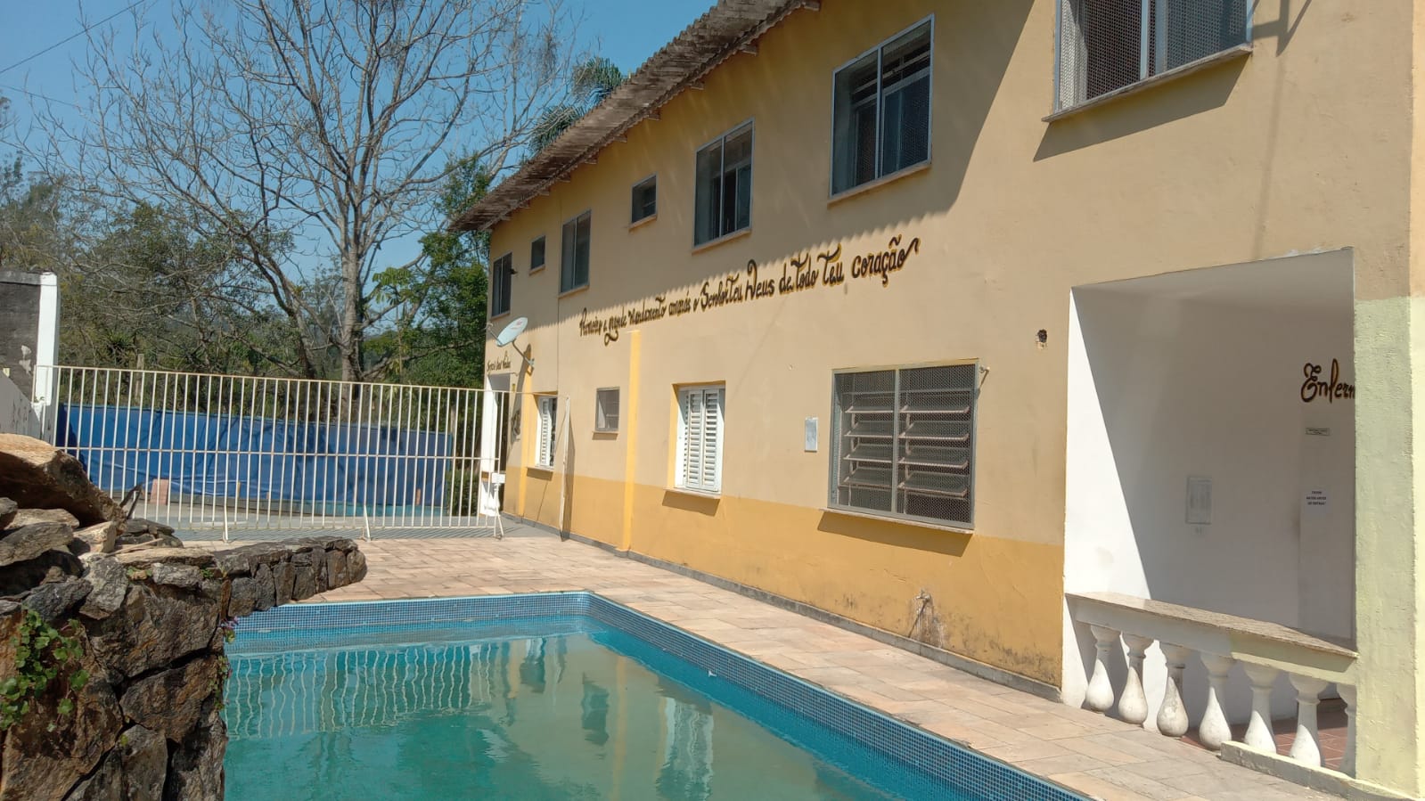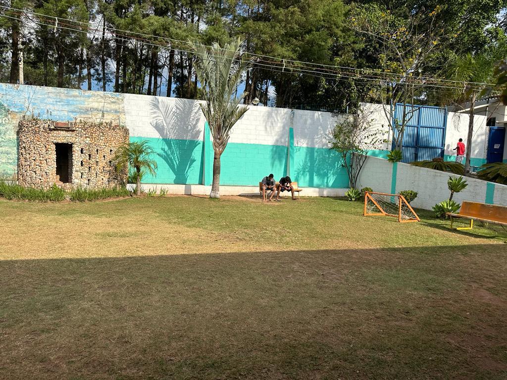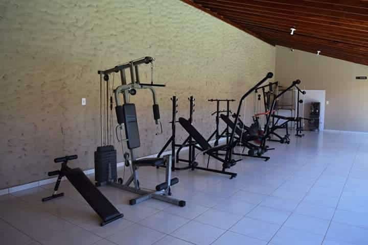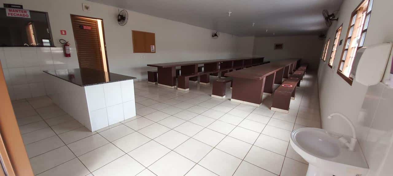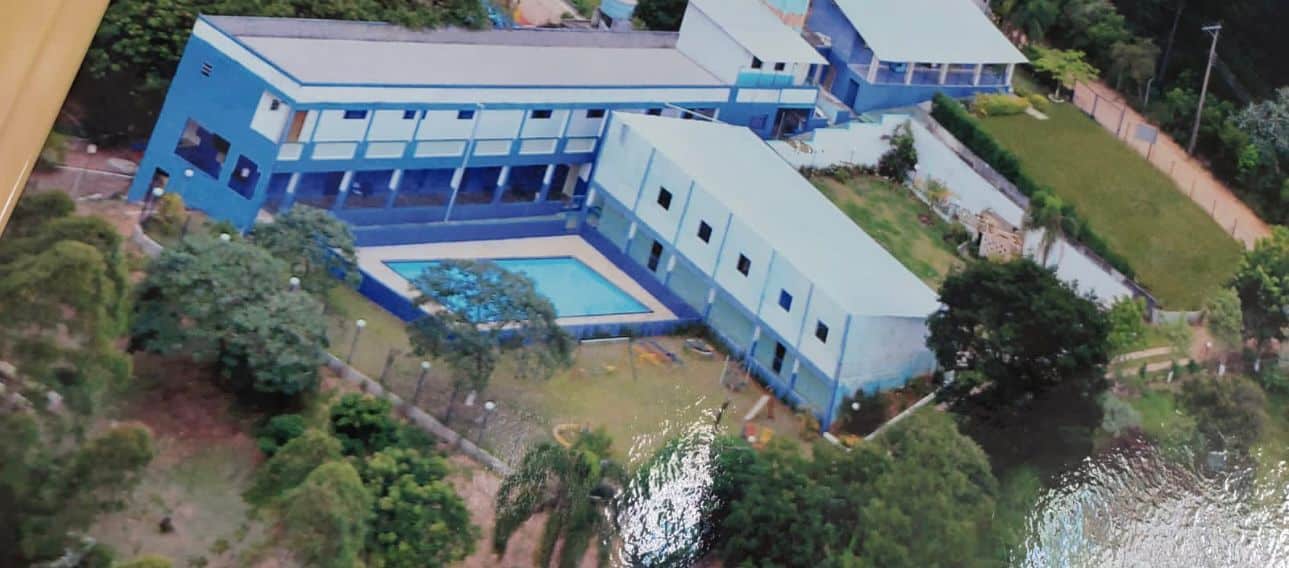 Ambientes equipados com piscina, academia, campo e quadra para esportes, refeitório, além de uma área ampla.