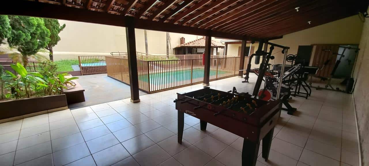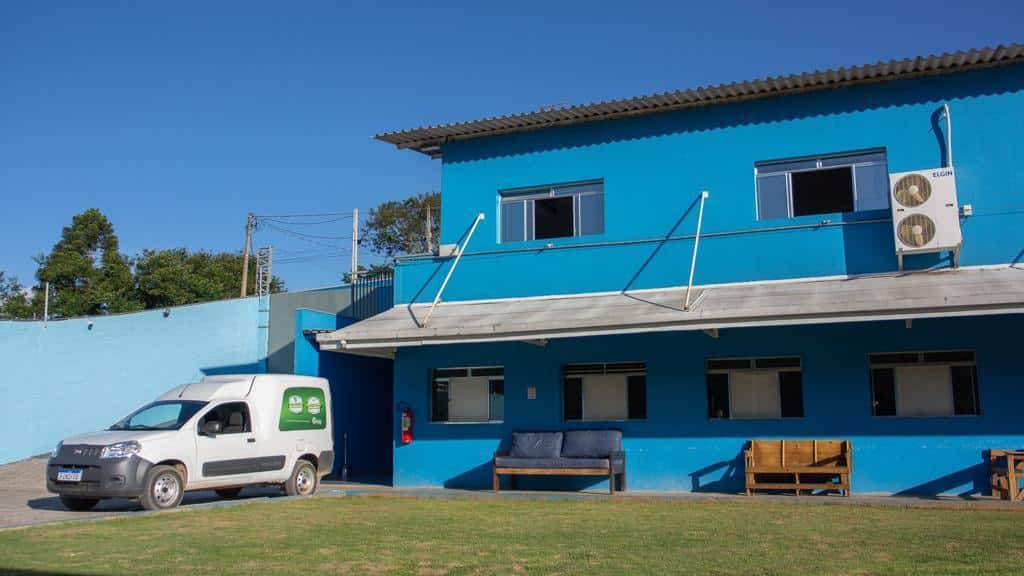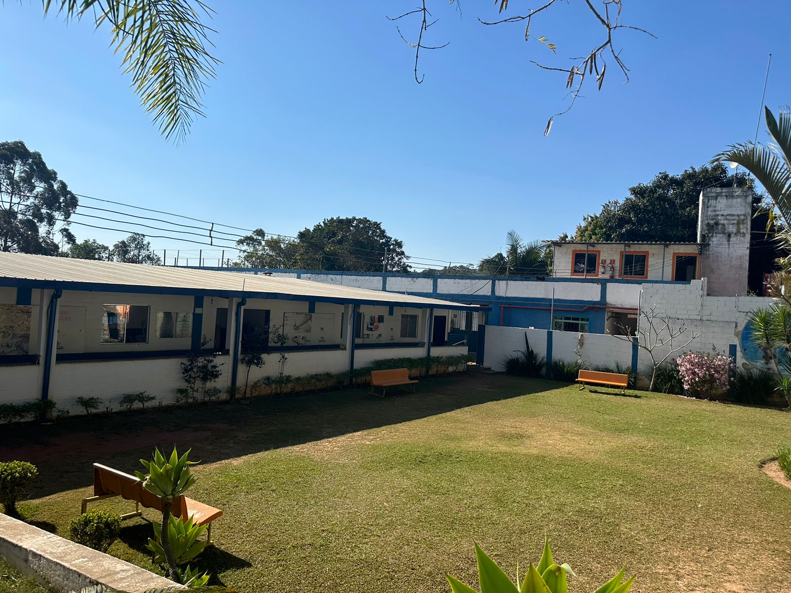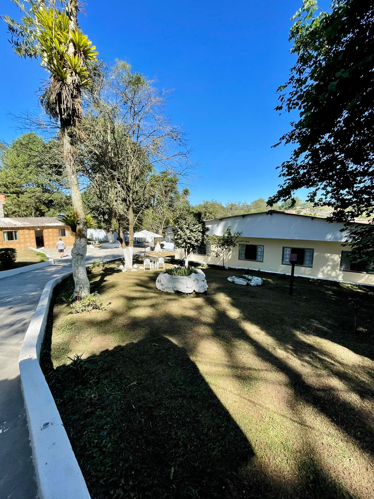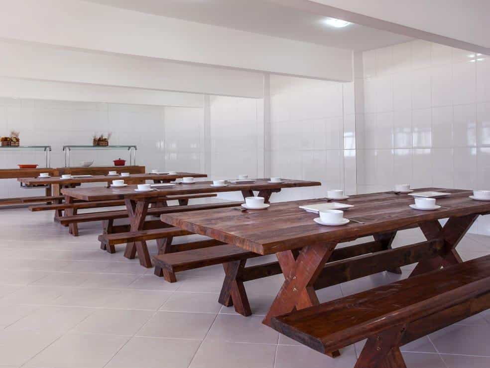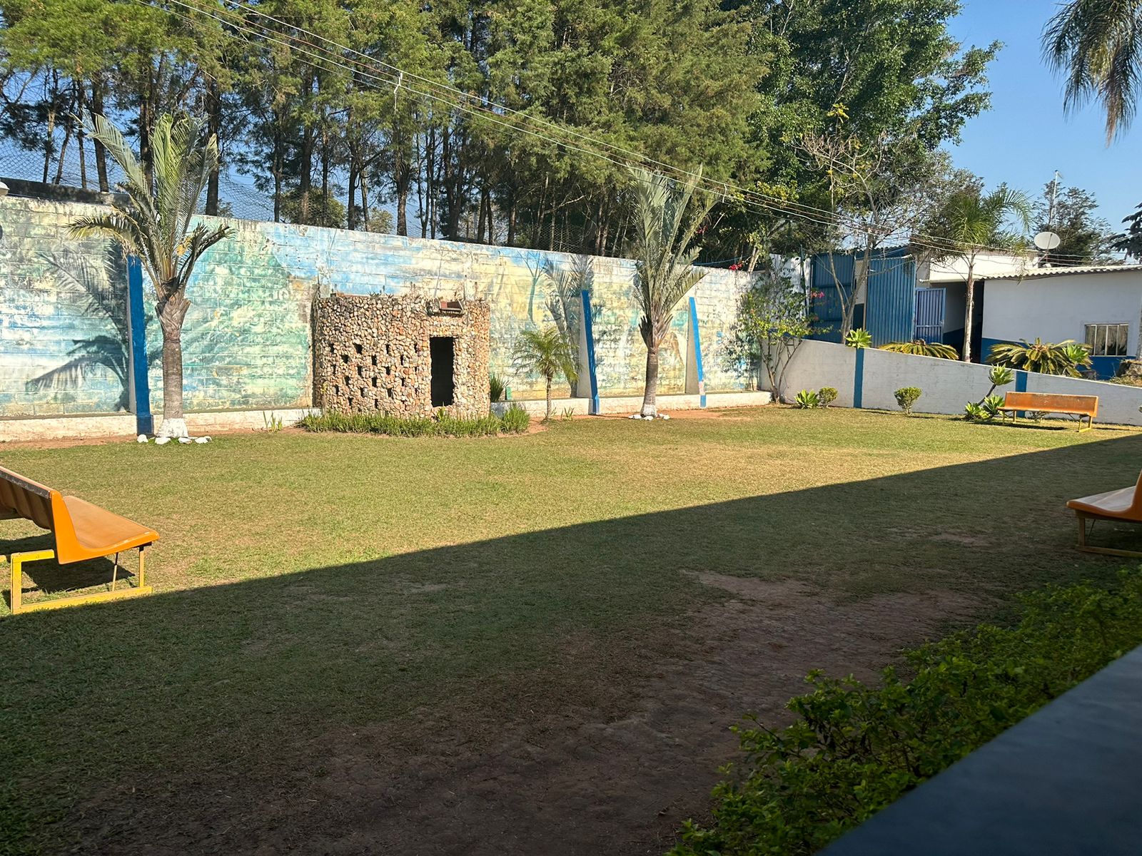 Ambientes equipados com piscina, academia, campo e quadra para esportes, refeitório, além de uma área ampla.